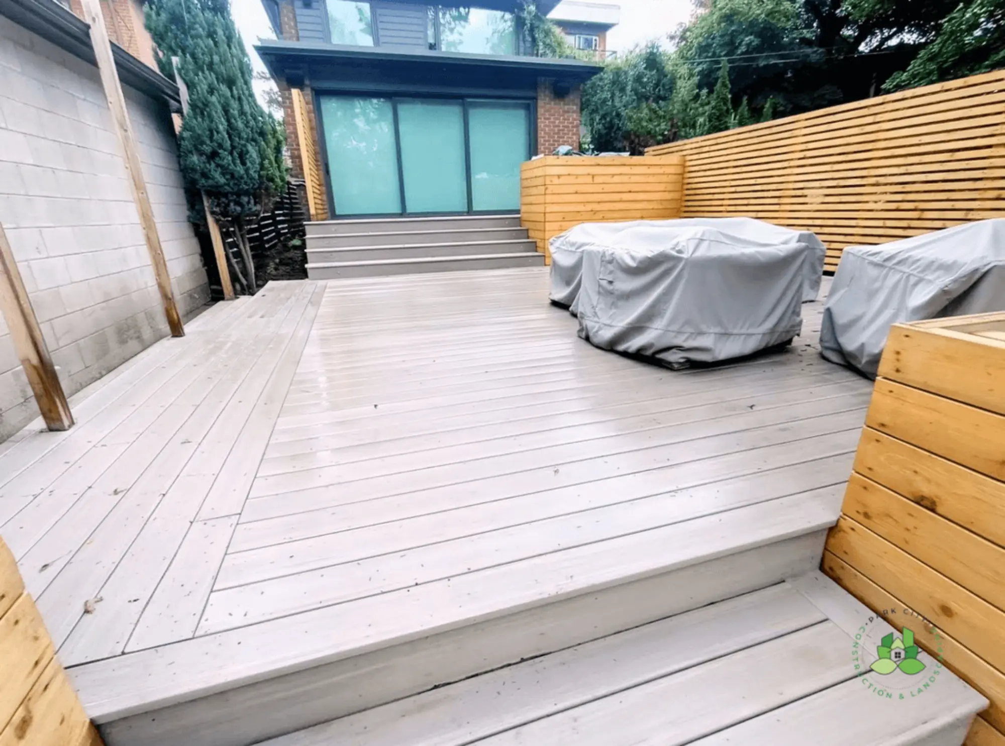 This comprehensive landscaping project in Toronto included full demolition and disposal of existing structures, deck refacing with newly built stairs, and the installation of an interlocking paver patio. The property was finished with fresh sod installation and an 8-foot-tall, fully private pressure-treated fence, creating a functional, polished, and private outdoor living space.