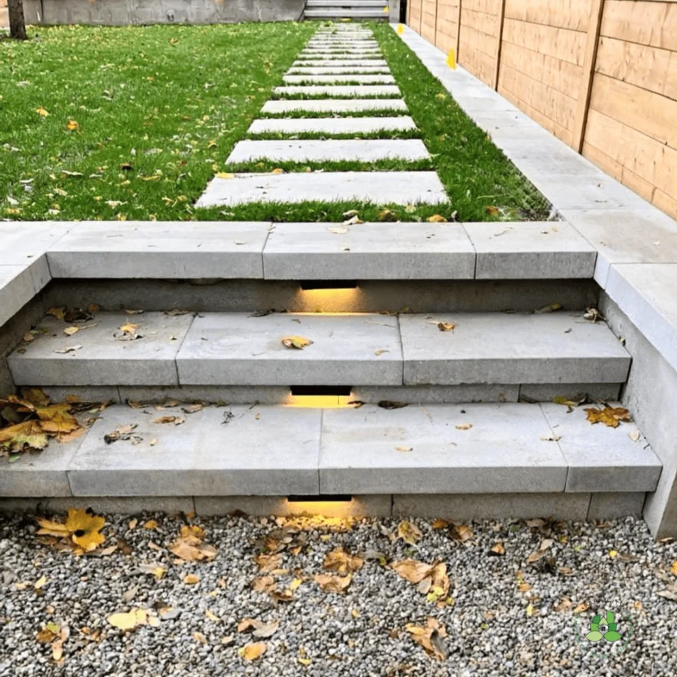 Modan steps with coping were installed to improve access and elevation transitions, along with new deck stairs and retaining wall coping for added durability and a finished look. Additional improvements included pea gravel installation, tree removal, and fresh mulch application to refine the overall landscape design.The project was completed with integrated outdoor lighting, including In-Lite Hyve 22 RV deck lights and low-voltage flood lighting installed under coping, enhancing safety and ambiance after dark. Post replacements were also completed to ensure long-term structural integrity.