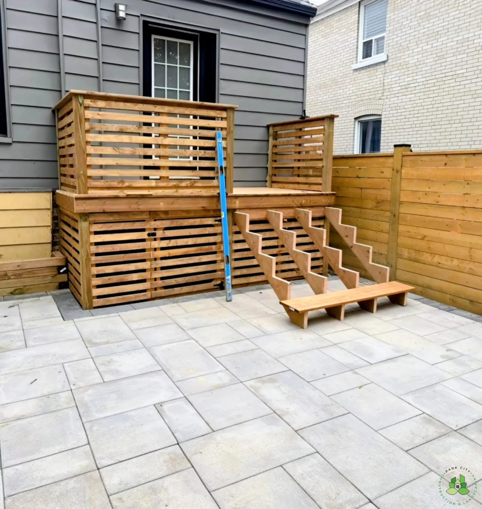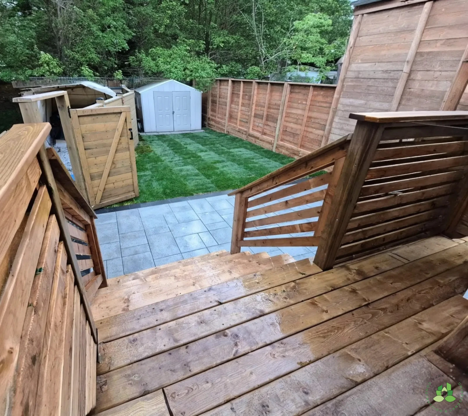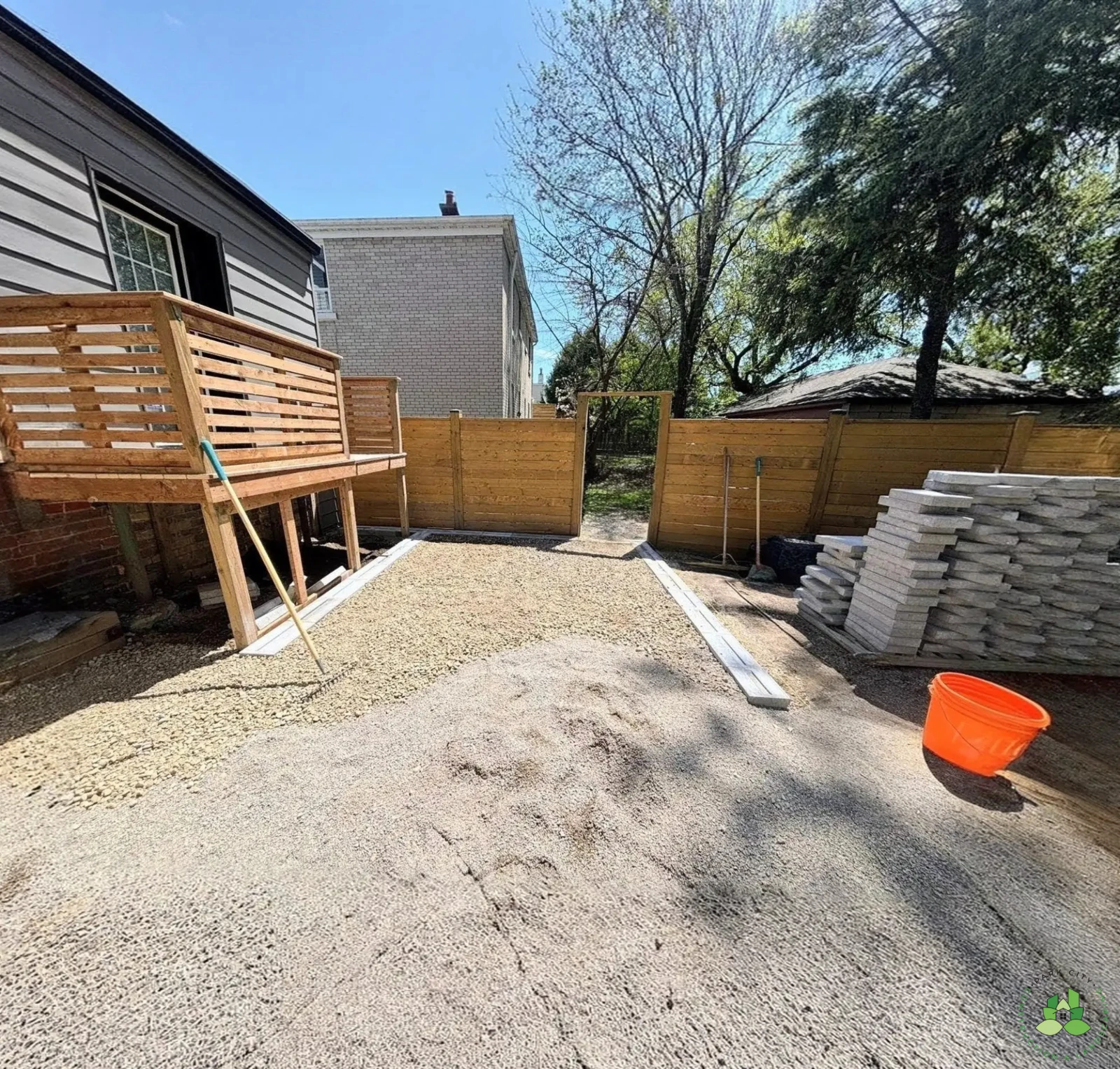 This comprehensive landscaping project in Toronto included full demolition and disposal of existing structures, deck refacing with newly built stairs, and the installation of an interlocking paver patio. The property was finished with fresh sod installation and an 8-foot-tall, fully private pressure-treated fence, creating a functional, polished, and private outdoor living space.