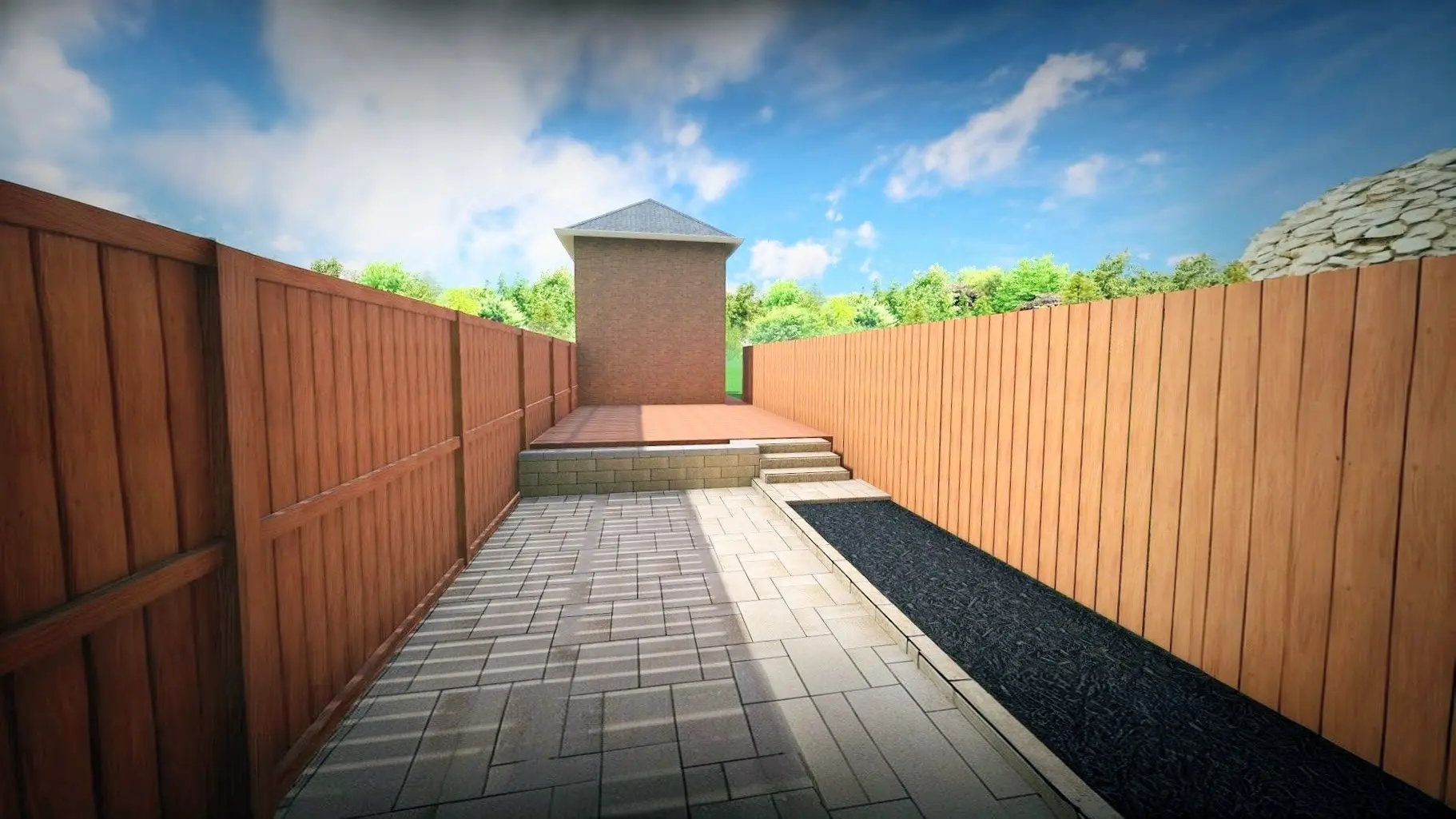A complete landscaping project in Toronto including new steps, a backyard patio, fence and gate installation, supported by a detailed 3D rendering.