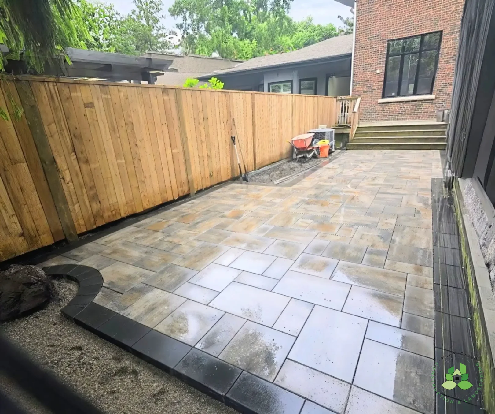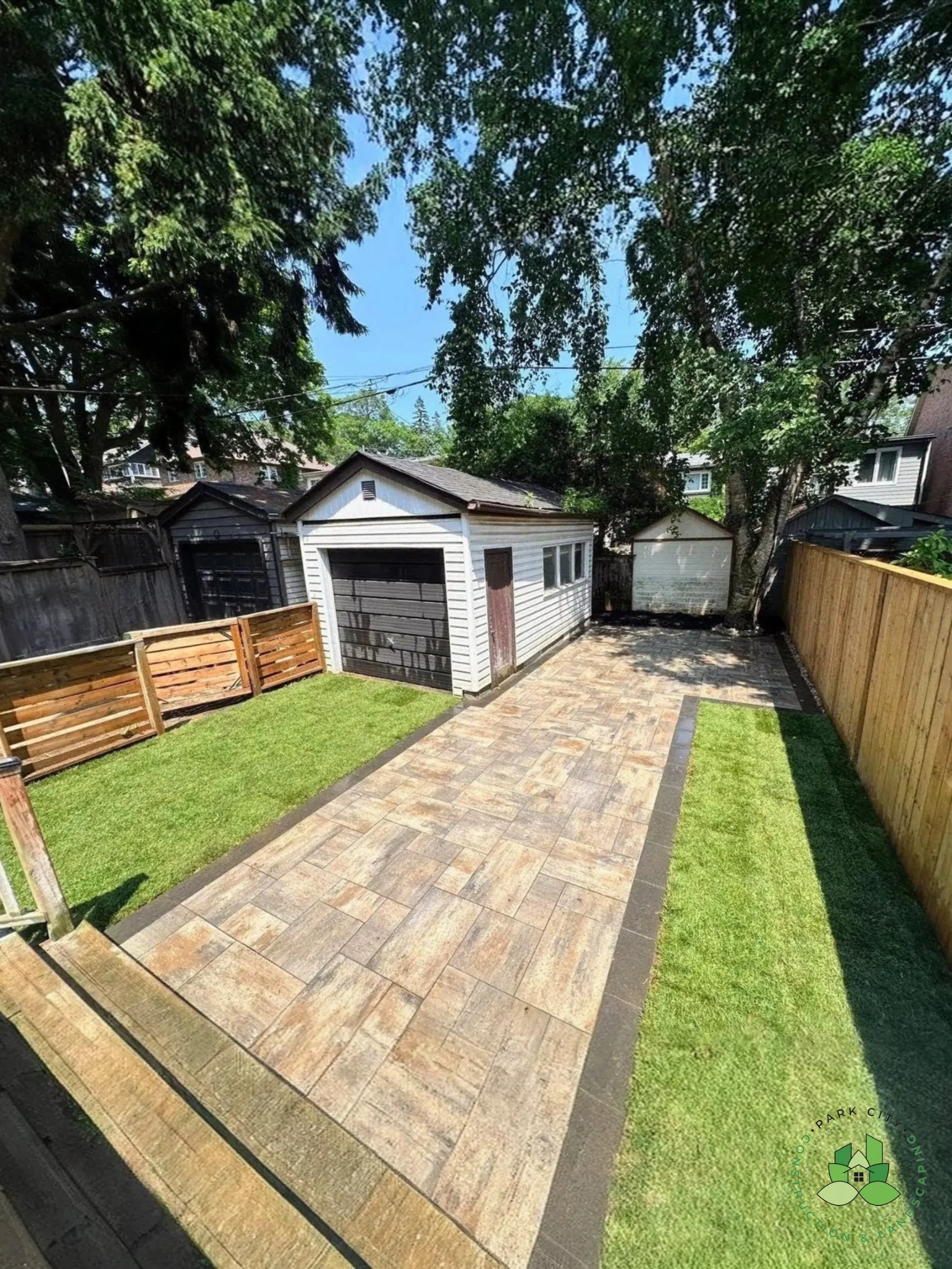 This comprehensive landscaping project in Toronto included full demolition and disposal of existing structures, deck refacing with newly built stairs, and the installation of an interlocking paver patio. The property was finished with fresh sod installation and an 8-foot-tall, fully private pressure-treated fence, creating a functional, polished, and private outdoor living space.