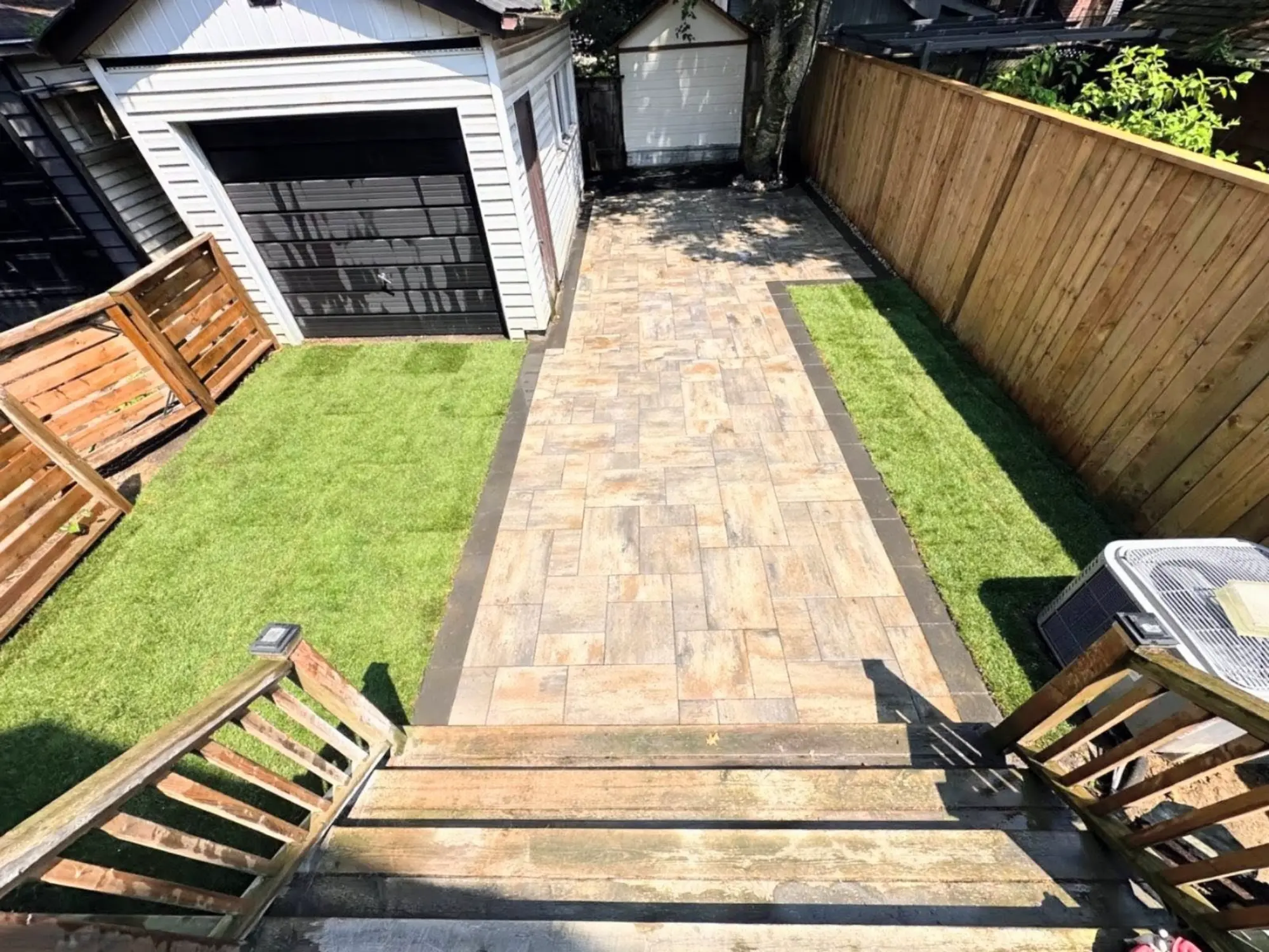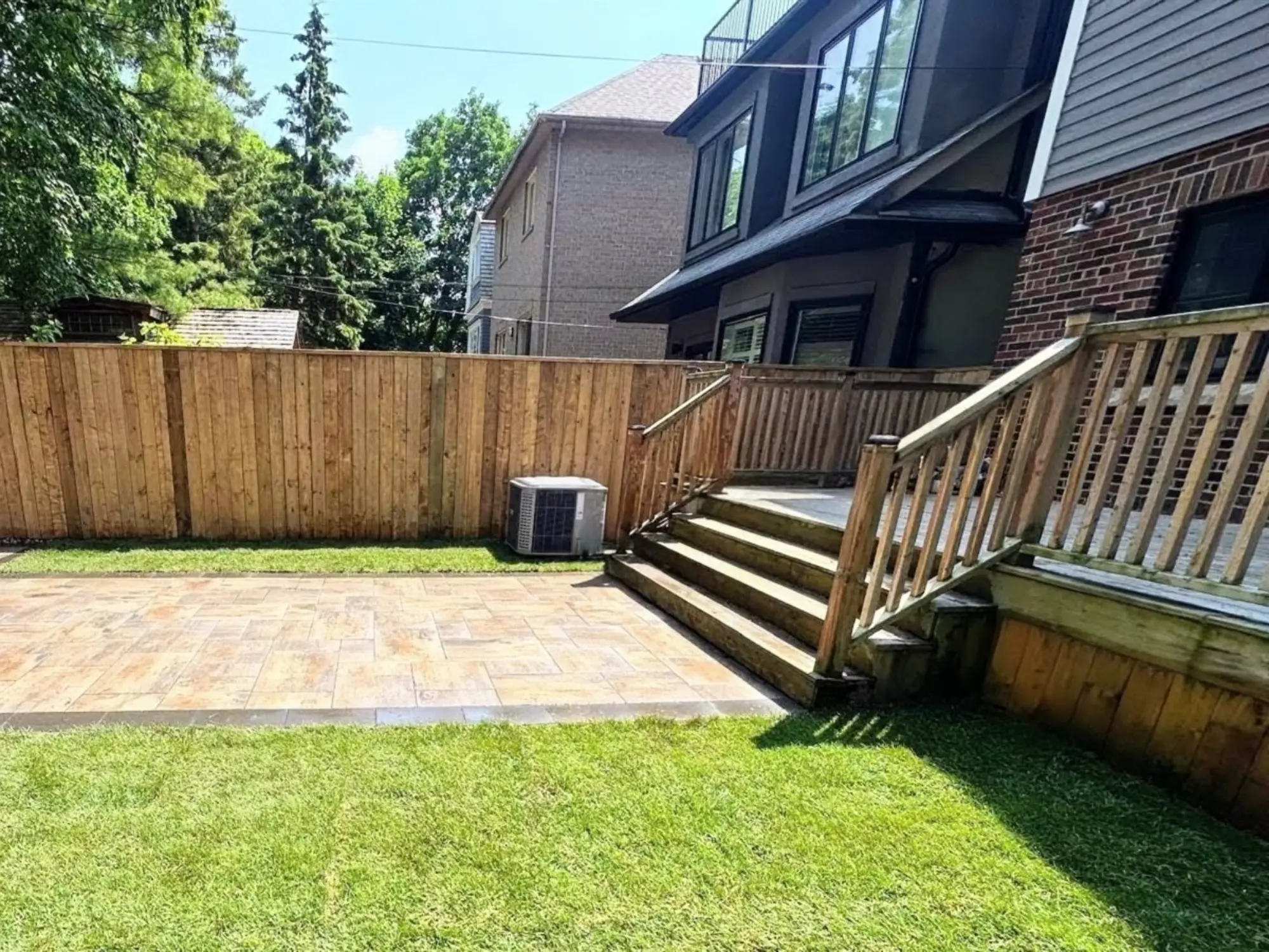 A complete landscaping project in Toronto including demolition and disposal, deck refacing with new stairs, an interlocking paver patio, fresh sod, and an 8-foot tall fully private pressure-treated fence.